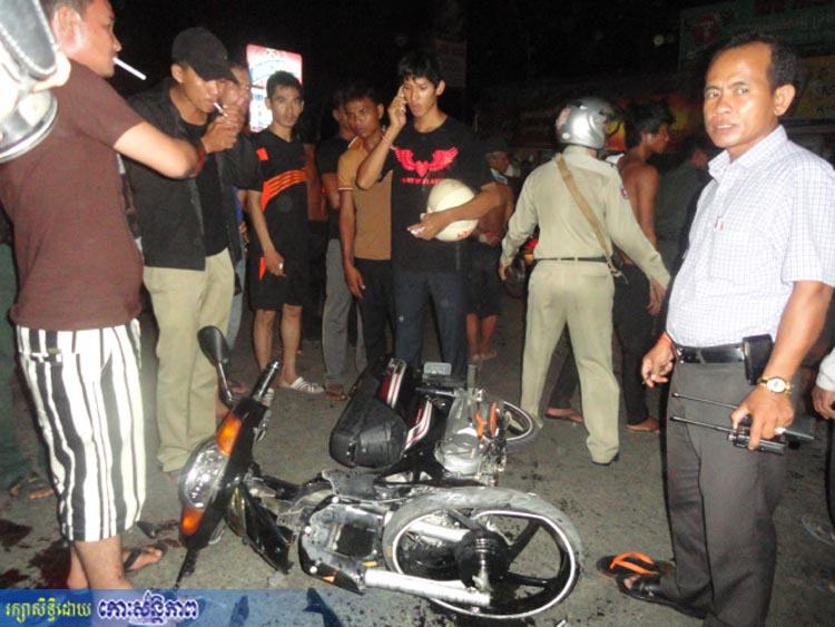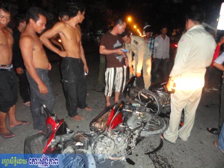 រាជធានីភ្នំពេញ៖ ម៉ូតូវីវ៉ា ពណ៌ក្រហម ជិះចេញពីក្លឹបឆ្លងផ្លូវពីឆ្វេងទៅស្ដាំ ស្រាប់តែមានម៉ូតូមួយគ្រឿងទៀតម៉ាក សេ១២៥ ស៊េរី២០១២ ពណ៌ខ្មៅ ជិះគ្នា២នាក់ បើកលឿនស្លេវទៅបុកពេញទំហឹង បណ្ដាលឱ្យដួលរងរបួសធ្ងន់ទាំង៣នាក់ កាលពីវេលាម៉ោង១០ និង២០នាទី យប់ថ្ងៃទី៩ មិថុនា ២០១៣ នៅតាមបណ្ដោយផ្លូវ