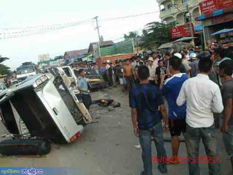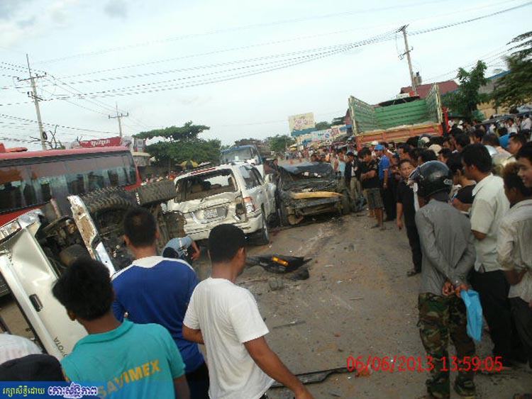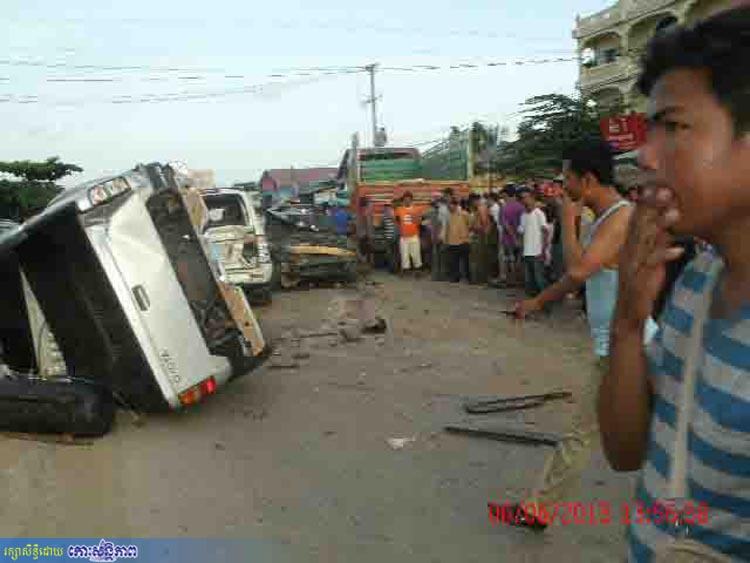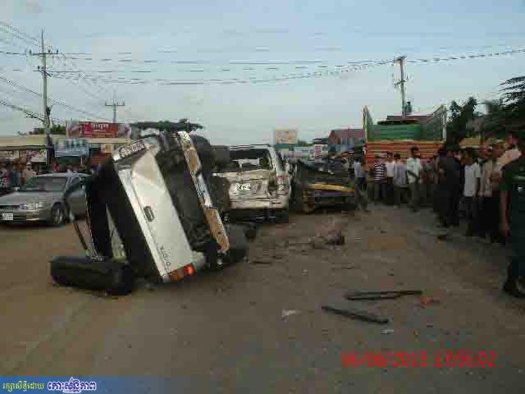ក្រុងប៉ោយប៉ែត ៖ ព័ត៌មានជំហានដំបូងបានឱ្យដឹងថា រថយន្តបុកគ្នាបន្តកន្ទុយ៤តង់ បណ្តាលឱ្យក្រពឹតរួញជាប់គ្នា មើលទៅគួរឱ្យរន្ធត់ និងបង្កឱ្យមានការភ្ញាក់ផ្អើល កាលពីវេលាម៉ោង៥ និង២៥នាទីល្ងាចថ្ងៃទី១០ មិថុនា ២០១៣ លើកំណាត់ផ្លូវជាតិលេខ៥ ស្ថិតក្នុងភូមិផ្សារកណ្តាល សង្កាត់ផ្សារកណ្តាល ក្រុងប៉ោយប៉ែត ។