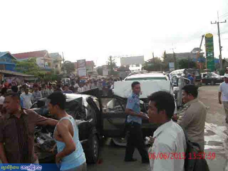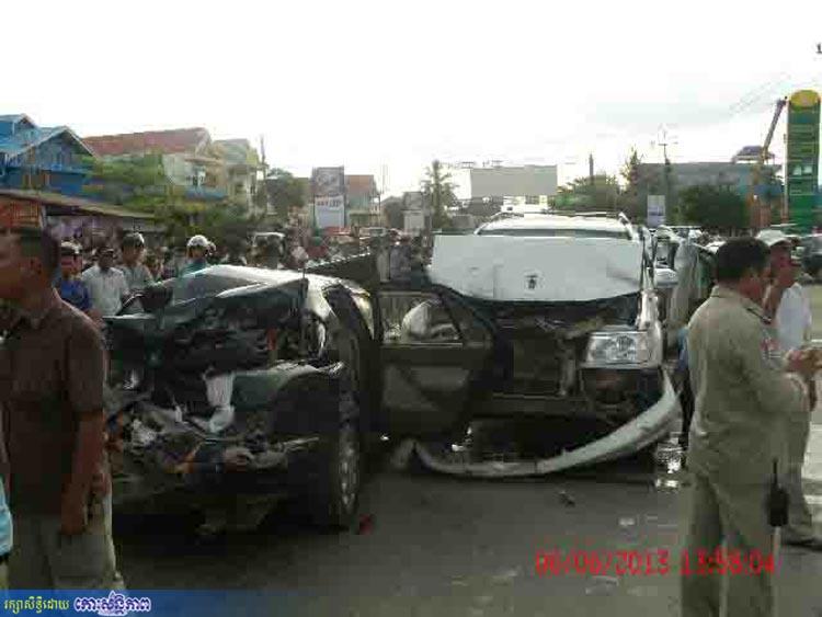 ២-ម៉ាកឡង់គ្រីស្ស័រ ពណ៌ស ចង្កូតស្តាំ ពាក់ស្លាកលេខ ភ្នំពេញ 2G-2286 បើកដោយឈ្មោះ កែវ សារិន ជាមន្ត្រីយោធាអភិវឌ្ឍន៍ភូមិភាគទី៥ ប្រចាំនៅបន្ទាត់ព្រំដែន ឃុំគោករមៀត ស្រុកថ្មពួក ។ រីឯអ្នកបើកបរមិនមានគ្រោះថ្នាក់ទេ ។ ៣-ម៉ាកតាកូម៉ា ពណ៌ទឹកប្រាក់ ចង្កូតឆ្វេង ពាក់ស្លាកលេខ ភ្នំពេញ 2V-4073 បើកដោយឈ្មោះ ញៀប បូរ ភេទប្រុស អាយុ២៨ឆ្នាំ មានទីលំនៅភូមិប្រជាធម្មខាងលិច សង្កាត់ផ្សារកណ្តាល មិនមានរបួសទេ ប៉ុន្តែរថយន្តផ្ទុះពោងទាំងពីរ ។ ៤-ម៉ាក FUSO ចង្កូតស្តាំ ពណ៌ក្រហម ពាក់ស្លាកលេខ ស្វាយរៀង 3A-0466 អ្នកបើកបរបានរត់គេចខ្លួនបាត់ យកទាំងសោរថយន្តទៅជាមួយ ពុំស្គាល់អត្តសញ្ញាណឡើយ ហើយរថយន្តខាងលើជារថយន្តដឹកស៊ីម៉ង់ត៍ ។