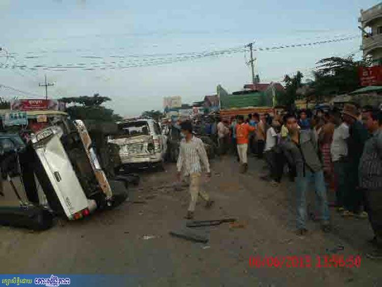 ក្រុងប៉ោយប៉ែត ៖ គ្រោះថ្នាក់ចរាចរណ៍ដ៏សាហាវមួយបានបង្កឱ្យរថយន្ត៣គ្រឿង ក្នុងចំណោម៥គ្រឿង ទាំងធំទាំងតូចត្រូវខូចខាតយ៉ាងដំណំ ក្នុងហេតុការណ៍បុកគ្នាជាបន្តបន្ទាប់លើដងផ្លូវជាតិលេខ៥ ខ្លះខ្ទេចមុខ ខ្លះក្រឡាប់កណ្តាលទ្រូងផ្លូវ ក្នុងភូមិកណ្តាល សង្កាត់ផ្សារកណ្តាល ក្រុងប៉ោយប៉ែត កាលពីវេលាម៉ោងជិត៦ល្ងាច ថ្ងៃទី១០ មិថុនា ។