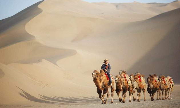 បុរសម្នាក់នាំហ្វូងអូដ្ឋឆ្លងវាលខ្សាច់ ស្ថិតនៅក្បែរបឹងចំណីតព្រះខែ ក្នុងទីក្រុងទុងហួង តំបន់គាន់ស៊ូ ប្រទេសចិន ។