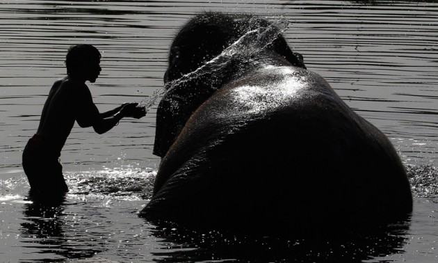 បុរសជនជាតិឥណ្ឌា ងូតទឹកឱ្យដំរីនៅទន្លេយ៉ាមូណា ក្រុងញូវដេលី ខណៈពេលដែលអាកាសធាតុមានកម្តៅជិត៤៥អង្សាសេ ។