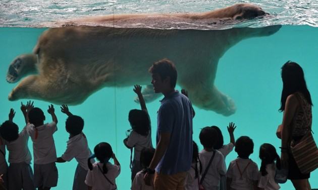 សិស្សសាលាទាំងឡាយសប្បាយរីករាយដែលបានឃើញខ្លាឃ្មុំតំបន់ប៉ូលហែលទឹកនៅឧទ្យានសត្វ ប្រទេសសិង្ហបុរី ៕