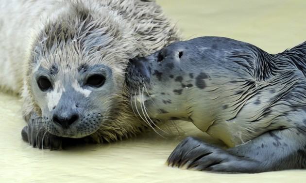 ភេ២ក្បាលថើបគ្នានៅឯឧទ្យានការពារសត្វសមុទ្រ ក្នុងទីក្រុងហ្វាយឌ្រិកឃុក ប្រទេសអាល្លឺម៉ង់ ក្រោយពីអាជ្ញាធរប្រទះឃើញដោយចៃដន្យនៅភាគខាងជើងឆ្នេរខ្សាច់ហែលហ្គោលែន ។