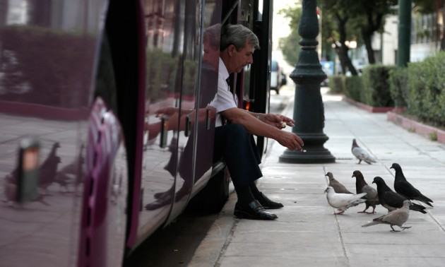 អ្នកបើកបររថយន្តក្រុងម្នាក់អង្គុយផ្តល់ចំណីដល់ព្រាបក្នុងអំឡុងពេលរង់ចាំអ្នកដំណើរនៅខាងក្រៅសណ្ឋាគារ ក្នុងទីក្រុងអាតែន ប្រទេសក្រិក ។