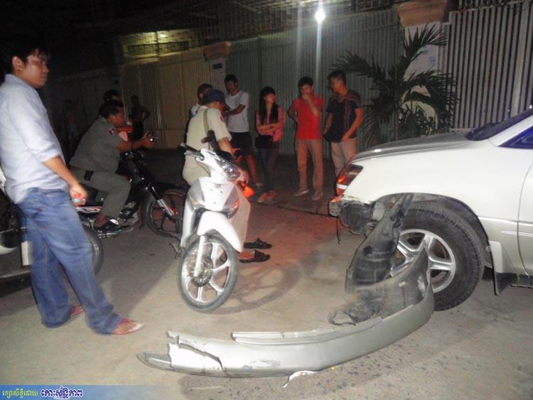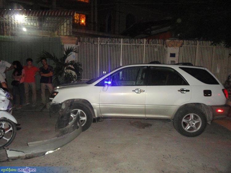 រាជធានីភ្នំពេញ ៖ រថយន្តឡិចស៊ីសធុន RX300 ពណ៌ស ពាក់ស្លាកលេខភ្នំពេញ 2U-8006 ជិះដោយប្រុសស្រី២នាក់ជាជនជាតិចិន ជ្រុលទៅបុករថយន្តកាមរីឆ្លាម ពណ៌ត្រីឆ្លូញ ពាក់ស្លាកលេខព្រះសីហនុ 2A-2637 ជិះដោយប្រុសស្រី២នាក់ដូចគ្នា បណ្តាលឲ្យក្រពឹតទ្វារក្រោយចំហៀងខាងឆ្វេង និងដាច់កង់ក្រោយខាងឆ្វេង។ គ្រោះថ្នាក់នេះកើតឡើងកាលពីវេលាម៉ោង៩និង១៥នាទីយប់ថ្ងៃទី១២ មិថុនា តាមផ្លូវលេខ៦០៦កែងផ្លូវលេខ៣០៧ ក្នុងសង្កាត់បឹងកក់ទី២ ខណ្ឌទួលគោក ។