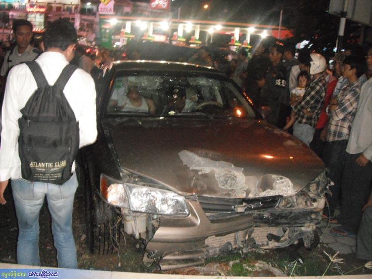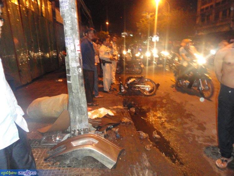 រាជធានីភ្នំពេញ ៖ បុរសម្នាក់រងរបួសធ្ងន់ ខណៈពេលកំពុងជិះម៉ូតូ ស្រាប់តែរថយន្តបើកជ្រុលទៅបុកពីក្រោយពេញទំហឹងធ្វើឱ្យម៉ូតូផ្លោងទៅបោកផ្ទប់បង្គោលភ្លើងបំភ្លឺផ្លូវ ឯរថយន្តព្យាយាមបើករត់ តែត្រូវសមត្ថកិច្ចឃាត់បាន ។ គ្រោះថ្នាក់នេះកើតឡើងនៅវេលាម៉ោង៧និង២០នាទីយប់ថ្ងៃទី១២ មិថុនា តាមផ្លូវទេពផន ក្រុម១ ភូមិ១ សង្កាត់ទឹកល្អក់ទី២ ខណ្ឌទួលគោក ។