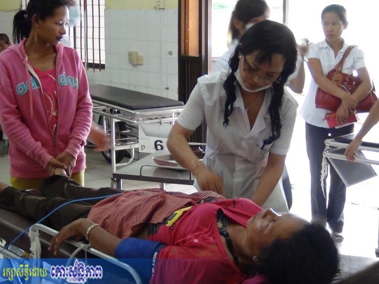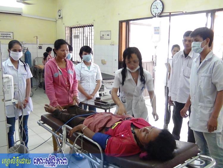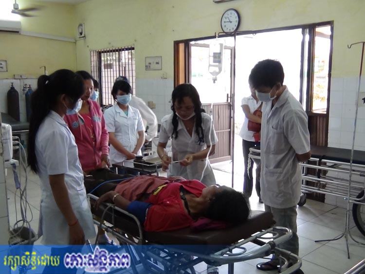 រាជធានីភ្នំពេញ៖ ស្ត្រីម្នាក់ត្រូវបានរថយន្តសង្គ្រោះដឹកទៅកាន់មន្ទីរពេទ្យព្រះកុសុមៈ ដើម្បីសង្គ្រោះបន្ទាន់បន្ទាប់ពីជិះតាមរថយន្តដឹកទេយ្យទានផ្សេងៗមាន កន្ទេល មុង ភួយជាដើមយកទៅប្រគេនព្រះសង្ឃនៅវត្តចំបកមានជ័យ ស្ថិតក្នុងភូមិត្រពាំងត្រឡប់ ឃុំសំរោងលើ ស្រុកអង្គស្នួល ខេត្តកណ្ដាល ហើយសន្លប់ស្ដូកស្ដឹង