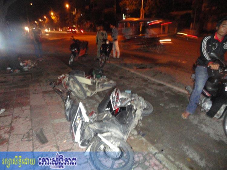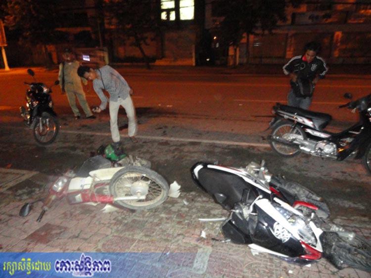 រាជធានីភ្នំពេញ៖ ម៉ូតូសង់កូរ៉េ ពណ៌ក្រហម បើកបរដោយជនបរទេស២ នាក់ ជិះឆ្លងផ្លូវជិតផុតទៅហើយ ស្រាប់តែម៉ូតូអ៊ែប្លែត ពណ៌ស ជិះគ្នា២នាក់ បុកចំពីមុខពេញទំហឹងបណ្ដាលឱ្យដួលរងរបួសធ្ងន់៣នាក់ និងស្រាលម្នាក់។