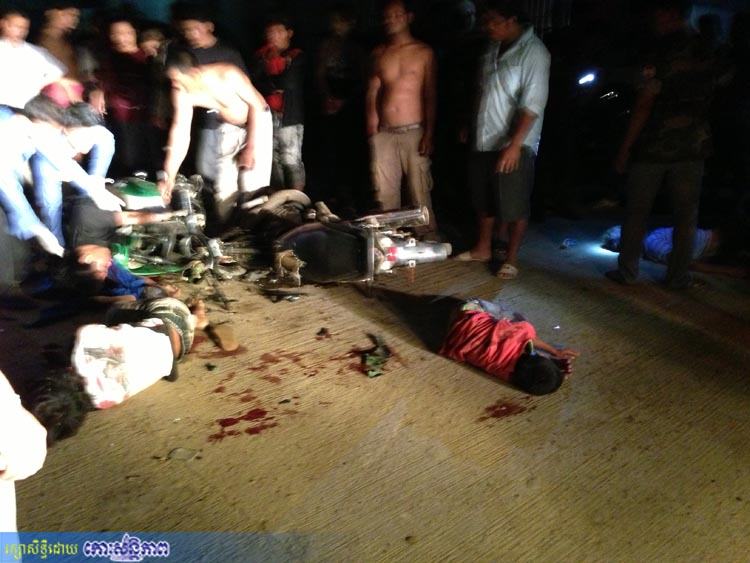 ខេត្តបន្ទាយមានជ័យ ៖ ជនរងគ្រោះ៤នាក់ក្នុងហេតុការណ៍គ្រោះថ្នាក់ចរាចរណ៍ដ៏រន្ធត់រវាងម៉ូតូស្គូពីបុកពេញទំហឹងជាមួយវ៉េវ ខណៈដែលជិះបញ្ច្រាសទិសគ្នា ហើយត្រូវបានក្រុមគ្រូពេទ្យបញ្ជូនបន្តពីមន្ទីរពេទ្យបង្អែកក្រុងប៉ោយប៉ែត ទៅមន្ទីរមិត្តភាពកម្ពុជា-ជប៉ុនមង្គលបុរីនោះ ត្រូវបានស្លាប់២នាក់ហើយ កាលពីវេលាម៉ោង៨ព្រឹកថ្ងៃទី១៨ មិថុនា ២០១៣ នេះ ដោយឡែកជនរងគ្រោះម្នាក់ដែលគេគិតថាស្រាល ក៏សន្លប់រហូតដល់ព្រឹកនេះនៅមិនទាន់ដឹងខ្លួនដែរ ។