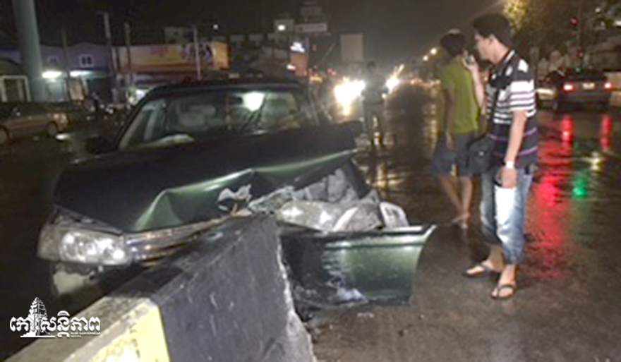 រាជធានីភ្នំពេញ ៖ បុរសជាជនជាតិចិនម្នាក់បានបើកបររថយន្តកាមរីឆ្លាម១គ្រឿង ពាក់ស្លាកលេខខេមរភូមិន្ទ បុករបាំងថ្មពុះចែកទ្រូងផ្លូវបណ្ដាលឲ្យបាក់អស់ចំនួន២កង់ រីឯរថយន្តបានកៀបជាប់នឹងរបាំងថ្មរងការខូចខាតយ៉ាងដំណំ ។