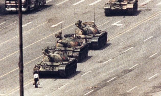 បុរសម្នាក់ឈរនៅពីមុខរថក្រោះ នៅលើដងផ្លូវសន្តិភាព ក្នុងទីក្រុងប៉េកាំង កាលពីថ្ងៃទី៥ មិថុនា ១៩៨៩ ឬនៅក្នុងអំឡុងពេលធ្វើបាតុកម្មប្រឆាំងនឹងរដ្ឋាភិបាលនៅឯទីលានធៀនអានមេន ៕