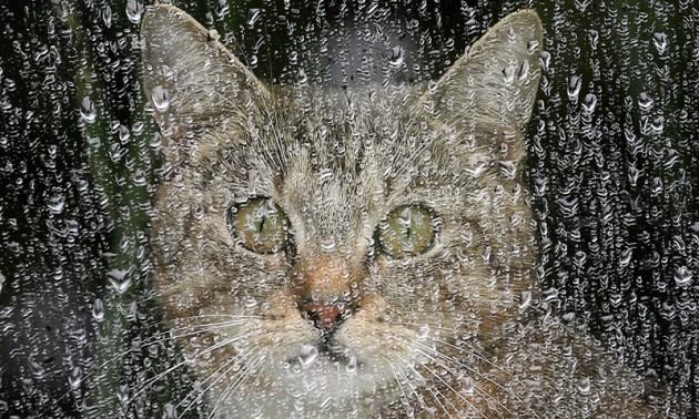 ឆ្មាមួយក្បាលអង្គុយមើលតំណក់ទឹកភ្លៀងនៅមាត់បង្អួច ។ ឆ្មានោះហាក់ដូចជាមានការចាប់អារម្មណ៍លើភ្លៀងនៅទីក្រុងប៊ែរឡាំង ប្រទេសអាល្លឺម៉ង់ ។