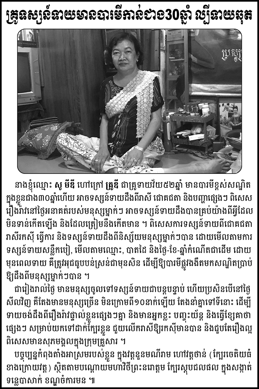 នាងខ្ញុំឈ្មោះ សូ មីឌី ហៅក្រៅ គ្រូឌី ជាគ្រូទាយវ័យ៥២ឆ្នាំ មានបារមីខ្ពស់សណ្ឋិត ក្នុងខ្លួនជាង៣០ឆ្នាំហើយ អាចទស្សន៍ទាយដឹងពីរាសី ជោគជតា…