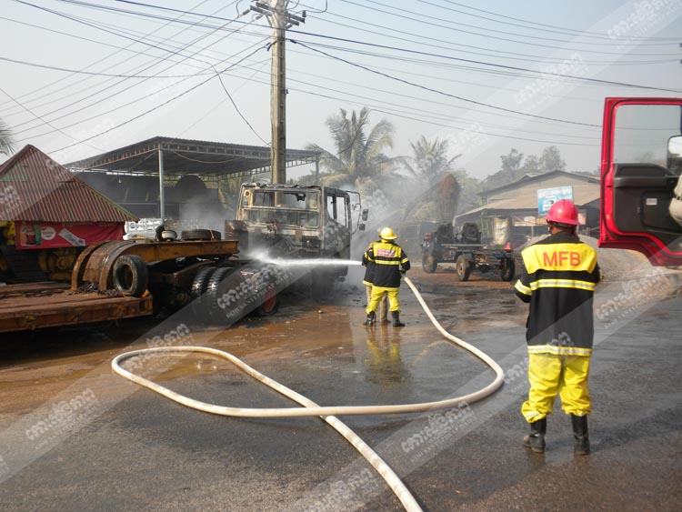 ឆេះរថយន្តដឹកគ្រឿងចក្រ ផ្អើលរថយន្តពន្លត់អគ្គិភ័យ២គ្រឿងទៅបាញ់ពន្លត់