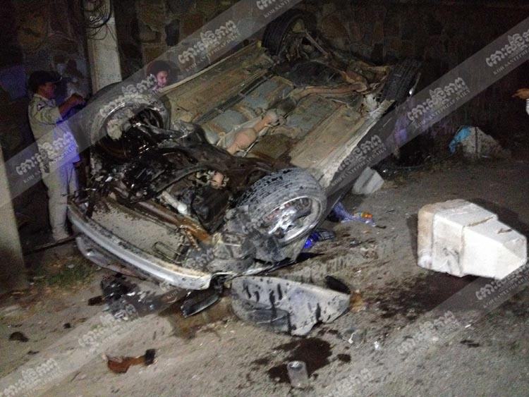 រាជធានីភ្នំពេញ ៖ នារី២នាក់ចេញពីក្លឹបកម្សាន្តឈ្លោះប្រកែកគ្នាជាមួយសង្សារបានបើករថយន្តបញ្ចេញកំហឹងបុកជាមួយបង្គោលតឿដាក់ច្រវាក់ រួចផ្លោងទៅបុកបង្គោលភ្លើងនៅជាប់របងស្ថានទូតរុស្ស៊ីក្រឡាប់ផ្ងារជើងឡើងលើទ្រមេឃរបួសធ្ងន់ទាំង២នាក់ ត្រូវសង្សារជិះម៉ូតូមកតាមក្រោយដឹកទៅសង្គ្រោះនៅមន្ទីរពេទ្យ។