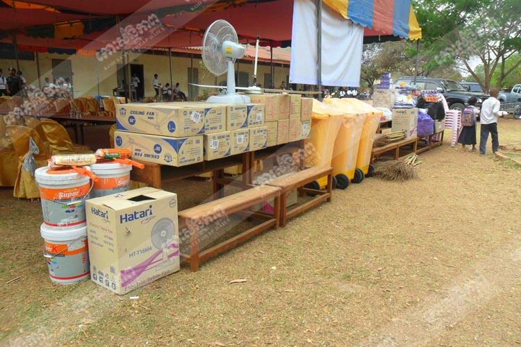 អំណោយជាសម្ភារបរិក្ខាទាំងនេះរួមមាន កង្ហារស្លាបវែង១៧, ស្លាបខ្លី៣, កៅអីជ័រ២៤, ថ្នាំលាបជញ្ជាំង៤ធុង, ប្រដាប់រុញលាបថ្នាំ៣, ធុងអនាម័យមានកង់៣, បាល់ទាត់៨, បាល់ទះ២, ហ្វីប្រូខ្នាតធំ-តូចជួសជុលដំបូល១៧០សន្លឹក, ខោអាវសិស្ស១៧សម្រាប់, សៀវភៅអានបកប្រែខ្មែរ-ថៃ២៤ក្បាល, សៀវភៅសរសេរ៨៦ក្បាល, តុជ័រវែង៦, ទឹកក្រូច៦យួរ, ទឹកសុទ្ធ៣០យួរ,នំស្រួយមួយចំនួន,រ៉ុកែតវាយ១គូ, ប៊ិច៤កំប៉ុង, បន្ទាត់៤ដុំ ដោយក្នុង១ដុំៗមាន១២ និងខ្មៅដៃ២កំប៉ុង។