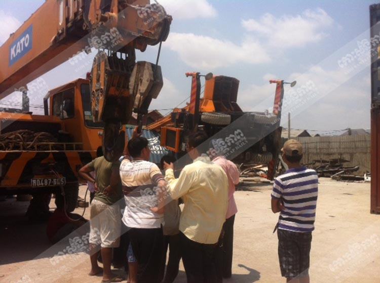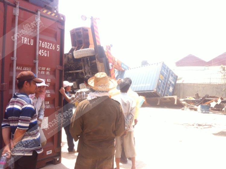 រាជធានីភ្នំពេញ ៖ រថយន្តស្ទូចកុងតឺន័រមួយគ្រឿង ខណៈដែលកំពុងដាក់កុងតឺន័រចុះក្រោមក៏ភ្លាត់ស្នៀតក្រឡាប់រថយន្តកិនពីលើកម្មករចំនួន៣នាក់ បណ្តាលឱ្យរងរបួសធ្ងន់ កាលពីវេលាម៉ោង១១ និង៤៤នាទីព្រឹកថ្ងៃទី១៤ មីនា ២០១៤ ស្ថិតនៅចំណុចយានដ្ឋានផ្លូវមុនីរ៉េត ក្នុងភូមិប្ញស្សី សង្កាត់ស្ទឹងមានជ័យ ។