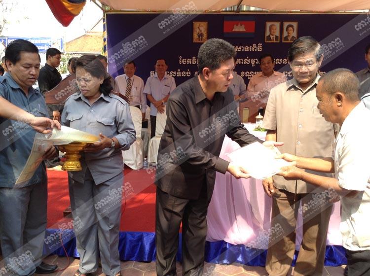 រាជធានីភ្នំពេញ ៖ ប្រជាពលរដ្ឋរស់នៅភូមិក្បាលទំនប់ សង្កាត់បឹងទំពុន ខណ្ឌមានជ័យ ជាង១ពាន់គ្រួសារបានទទួលវិញ្ញាបនបត្រសម្គាល់សិទ្ធិកាន់កាប់អចលនវត្ថុពីអាជ្ញាធរមូលដ្ឋាន និងមន្ត្រីជំនាញ កាលពីព្រឹកថ្ងៃទី២៧ មីនា ២០១៤ ក្រោមអធិបតីភាពលោកគួច ចំរើន អភិបាលខណ្ឌមានជ័យ និងលោកជ្រាវ សុផាន់ អភិបាលរងរាជធានីភ្នំពេញ។