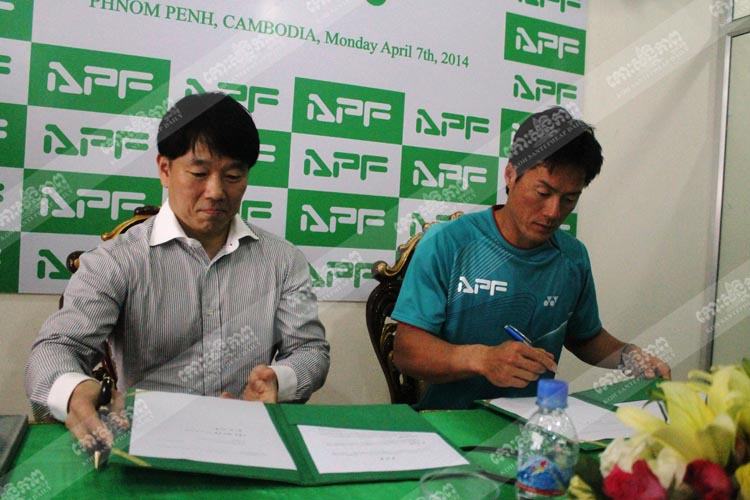 រាជធានីភ្នំពេញ ៖ នាយកក្រុមហ៊ុន APF Holdings លោក Mitsuji Konoshita កាលពីព្រឹកថ្ងៃទី៧ មេសា បានចុះកិច្ចព្រមព្រៀងឧបត្ថម្ភជួយដល់កីឡាករវាយកូនបាល់អាជីពរបស់ជប៉ុន លោក Toshihide Matsui នៅក្នុងទីស្នាក់ការក្រុមហ៊ុន GL Finance ដែលស្ថិតនៅផ្លូវកម្ពុជាក្រោម ។