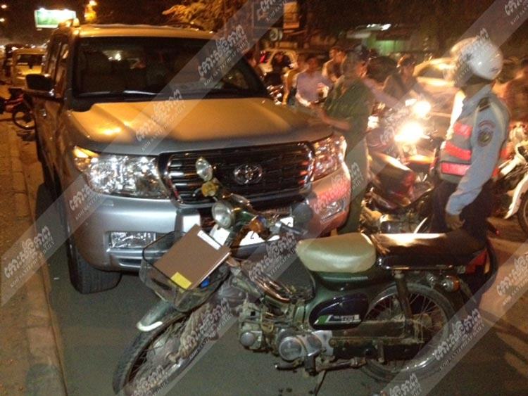 រាជធានីភ្នំពេញ ៖ យុវជន០២នាក់ ជិះម៉ូតូទៅបុកពីក្រោយគូថរយន្តកាមម៉ារីហាយប្រ៊ីត ហើយឡងម៉ូតូទៅប៉ះជាមួយរថយន្តឡង់គ្រីស័របណ្តាលឱ្យរថយន្តឡង់គ្រីស័រ កិនខ្ទេចម៉ូតូ និងអ្នកបើកម៉ូតូបាក់ភ្លៅ ឆ្វេងរបួសធ្ងន់ ចំណែកអ្នករួមដំណើរជាមួយរបួសស្រាល។ហេតុការណ៏នេះកើតឡើងនៅម៉ោង ៧និង ៣០នាទីយប់ថ្ងៃ ទី០៩ មេសា ២០១៤ នៅចំណុចមុខស្ថានទូតបារាំង តាមផ្លូវព្រះមុនីវង្ស ស្ថិតនៅសង្កាត់ស្រះចក ខណ្ឌដូនពេញ ។