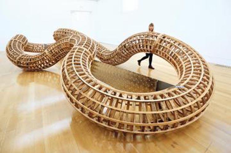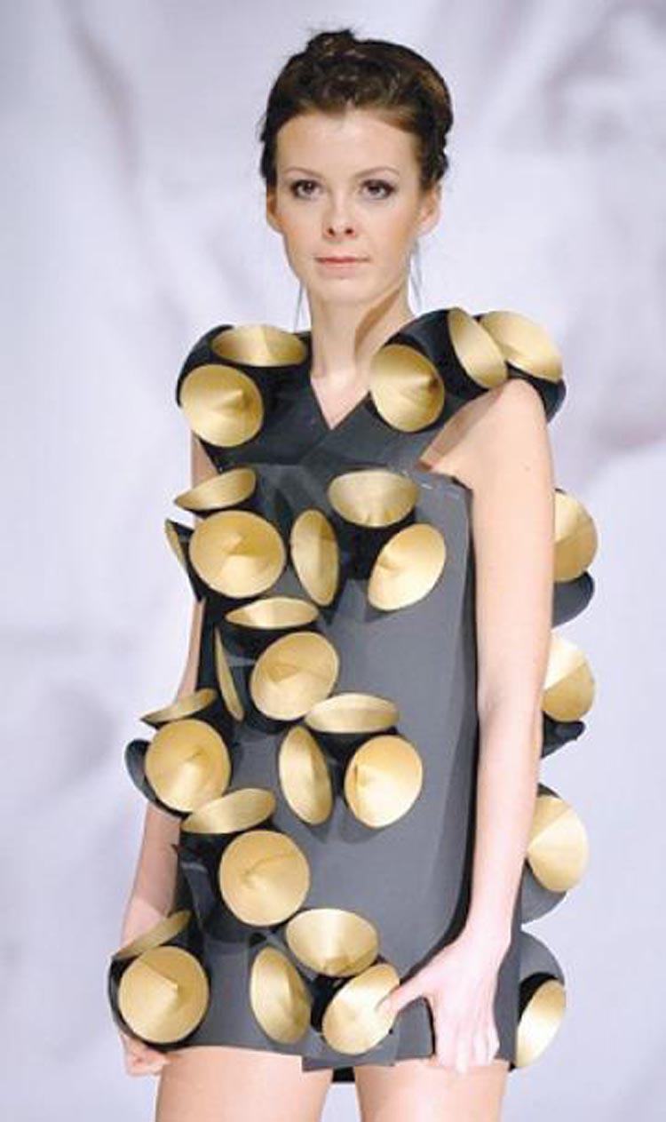 តារាបង្ហាញម៉ូដស្ថិតក្នុងឈុតសំពត់ខ្លីច្នៃពីក្រដាសជាសមិទ្ធផលរបស់និស្សិតសិល្បៈនៅក្នុងពិធីតាំងបង្ហាញម៉ូដច្នៃពីវត្ថុសំណល់ប្រចាំឆ្នាំ២០១៤ ក្នុងទីក្រុងក្រាកូវ ប្រទេសអេស្ប៉ាញ ។