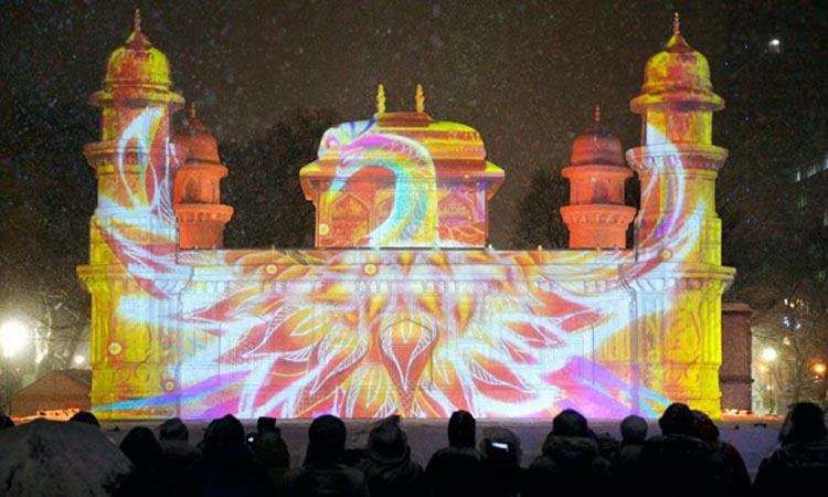 កុំព្យូទ័រក្រាហ្វិកបញ្ចាំងទៅលើរូបសំណាកព្រិលជាការសាកល្បងក្នុងទិវាព្រិលចាប់ផ្ដើមនៅតំបន់សាប់ប៉ូរ៉ូ ខេត្តហុកតៃដូ ប្រទេសជប៉ុន។