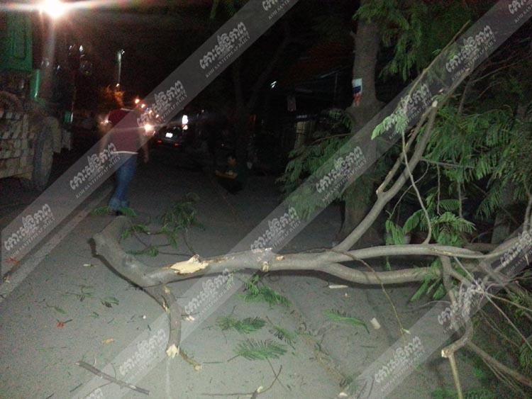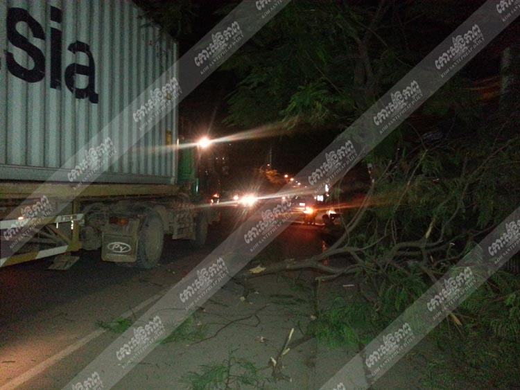 រាជធានីភ្នំពេញ ៖ រថយន្តកុងតឺន័រ ណព៌ផ្ទៃមេឃ ពាក់ស្លាកលេខ ភ្នំពេញ3A-2928 បានបើកក្នុងទិសដៅ ពីត្បូងមកជើង មកដល់ចំណុចផ្លូវ លេខ ២៧១ កែងនិងផ្លូវលេខ៤៣២ រថយន្តកុងតឺន័របានអែបកៀនផ្លូវ បណ្តាលឱ្យប៉ះនិងមែកឈើបាក់ធ្លាក់មកលើផ្លូវ ។