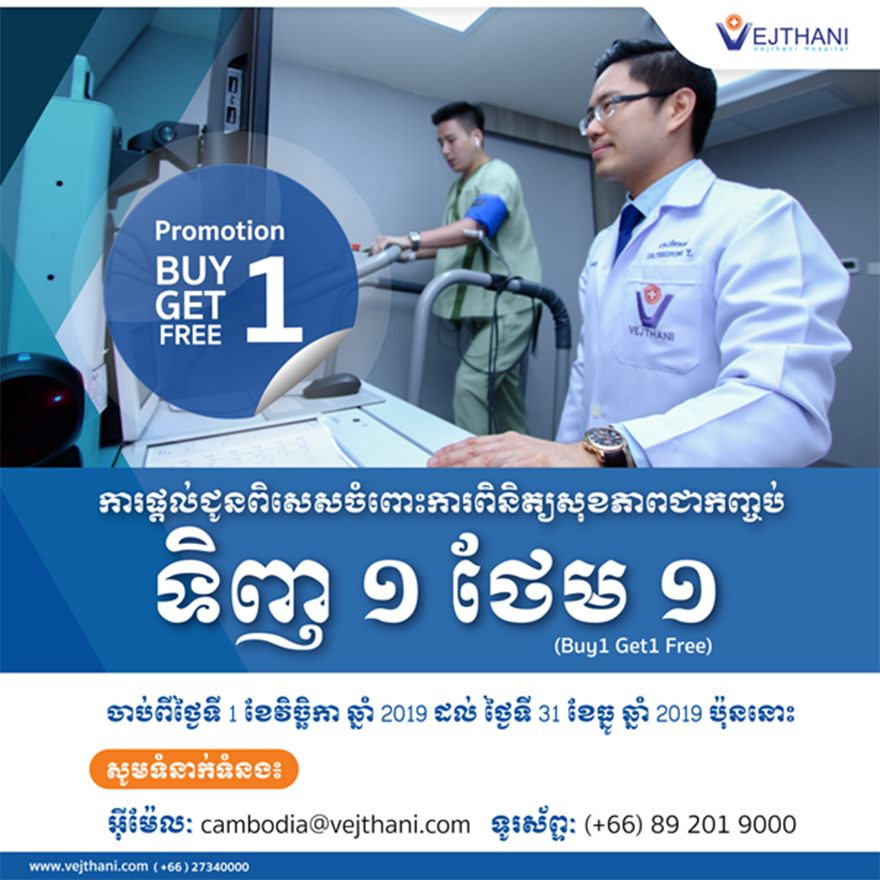 មជ្ឈមណ្ឌលពិនិត្យសុខភាពនៃមន្ទីរពេទ្យវេជ្ជថានី មានការផ្តល់ជូនពិសេសចំពោះការពិនិត្យសុខភាពជាកញ្ចប់ ទិញ ១ ថែម ១ (Buy1 Get1 Free) ចាប់ពីថ្ងៃទី ១ ខែវិច្ឆិកា ឆ្នាំ ២០១៩ ដល់ ថ្ងៃទី ៣១ ខែធ្នូ ឆ្នាំ ២០១៩ ប៉ុណ្ណោះ ៕