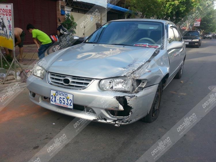 រាជធានីភ្នំពេញ ៖ បុរសម្នាក់ឈ្មោះធន់ សុវណ្ណវង្ស អាយុ២១ឆ្នាំ មានមុខរបរជានិស្សិត មានទីលំនៅផ្ទះលេខ៦០ ផ្លូវ២៨៩ សង្កាត់បឹងកក់ទី២ ខណ្ឌទួលគោក បានបើករថយន្តមួយគ្រឿងម៉ាកកូរ៉ូឡាគូទហើម ព៌ណទឹកប្រាក់ ពាក់ស្លាកលេខភ្នំពេញ២X-៦៥៣២ ទៅបុកនឹងម៉ូតូមួយគ្រឿងម៉ាកឌ្រីមសង់C125 ស៊េរីឆ្នាំ២០០៧ ពណ៌ខ្មៅ ពាក់ស្លាកលេខភ្នំពេញ១Q-៦០៣៥ក្នុងទិសដៅបញ្ចា្រសទិសគ្នា បណ្តាលឱ្យប្តីឈ្មោះឆោម ប៊ុនជឿន អាយុ៣៥ឆ្នាំនិងប្រពន្ធឈ្មោះលី សុភ័ក្រ អាយុ២៩ឆ្នាំ មានទីលំនៅក្នុងភូមិទន្សាយគៀច ឃុំដើមឬស្ស ស្រុកកណ្តាលស្ទឹង ខេត្តកណ្តាល ទាំងពីរនាក់ប្តីប្រពន្ធដែលមានមុខរបជាគ្រូបង្រៀននៅសាលាអនុវិទ្យាល័យហ៊ុន សែនដើមឬស្សរងរបួសបាក់ជើងម្នាក់ម្ខាងដូចគ្នាជាទម្ងន់។