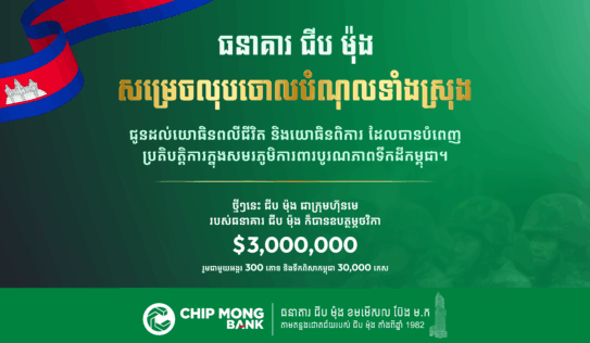 ក្រោមស្មារតីមនុស្សធម៌ សាមគ្គីភាព ធនាគារ ជីប ម៉ុង សម្រេចលុបបំណុលចោលទាំងស្រុងជូនយោធិនពលី និងយោធិនពិការ ក្នុងសមរភូមិការពារបូរណភាពទឹកដី 1 ថ្ងៃ មុន