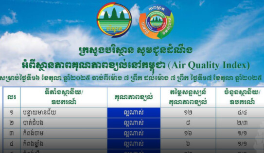 គុណភាពខ្យល់ទូទាំងប្រទេសកម្ពុជា ស្ថិតក្នុងកម្រិត «ល្អណាស់» ដោយមានកំហាប់ភាគល្អិតនិចលទាបបំផុត 4 ម៉ោង មុន