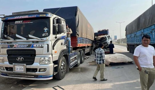 រថយន្តដឹកសាច់បង្កក បុករថយន្តដឹកអង្ករ កំពុងឈប់ចត បណ្ដាលឲ្យខ្ទេចមួយកំណាត់មុខ រងរបួសធ្ងន់ស្រាល៣នាក់ 2 ថ្ងៃ មុន