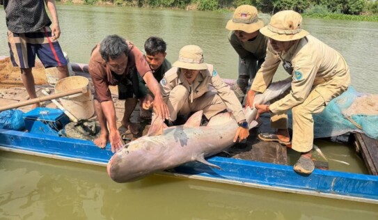 មន្ត្រីរដ្ឋបាលជលផលកំពង់ឆ្នាំងលែងត្រីរាជមួយក្បាលទម្ងន់៤០គីឡូក្រាមចូលទន្លេវិញ 3 អាទិត្យ មុន