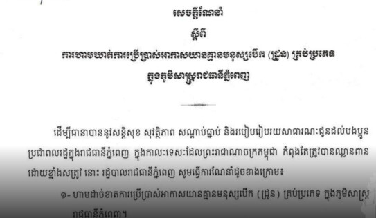 អាជ្ញាធរភ្នំពេញដាក់បម្រាមដាច់ខាតមិនឱ្យប្រើប្រាស់ដ្រូនគ្រប់ប្រភេទក្នុងភូមិសាស្ត្ររាជធានីភ្នំពេញឡើយ 1 អាទិត្យ មុន