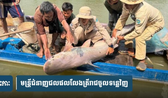 មន្ត្រីរដ្ឋបាលជលផលកំពង់ឆ្នាំងលែងត្រីរាជមួយក្បាលទម្ងន់៤០គីឡូក្រាមចូលទន្លេវិញ 3 អាទិត្យ មុន