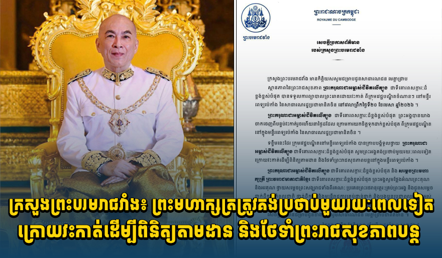 រាជធានីភ្នំពេញ ៖ ក្រសួងព្រះបរមរាជវាំង បានបញ្ជាក់ថា ព្រះមហាក្សត្រព្រះអង្គត្រូវគង់ប្រថាប់មួយរយៈពេលទៀត ក្រោយវះកាត់ ដើម្បីពិនិត្យតាមដាន និងថែទាំព្រះរាជសុខភាពបន្ត...