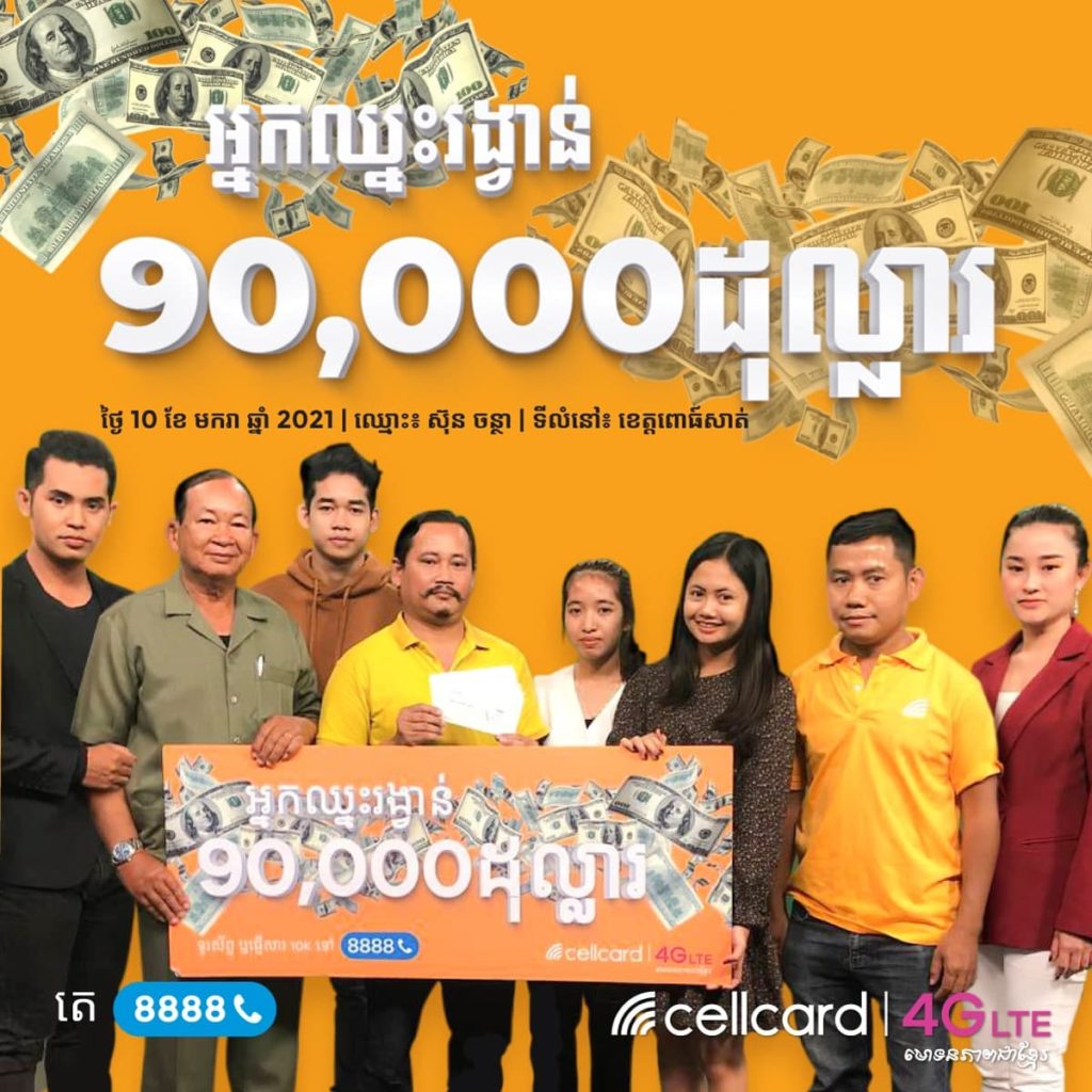 រាជធានីភ្នំពេញ ៖ អតិថិជនមហាសំណាង ! សូមចូលរួមអបអរសាទរដល់លោក ស៊ុន ចន្ថា ដែលមានមុខរបរជាអ្នកលក់ចាប់ហួយ និងមានទីលំនៅឃុំអូរតាគី ស្រុកបាកាន ខេត្តពោធ៍ិ៍សាត់ បានឈ្នះលុយសុទ្ធរហូតដល់ទៅ $90,000 ពីកម្មវិធី «ឈ្នះមួយម៉ឺនដុល្លាររាល់ថ្ងៃ» របស់ សែលកាត កាលពីថ្ងៃទី 10 ខែមករា ឆ្នាំ 2021 មកនេះ ។