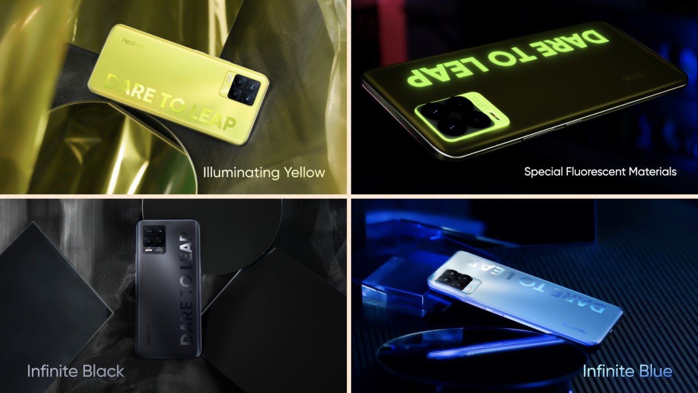 ផ្ទៃខាងក្រោយរបស់ realme 8 pro ភ្លឺរលោងរំលេចដោយពណ៌គ្រីស្តាល់ធម្មជាតិ ជាមួយនឹងពណ៌ខៀវ(Infinite Blue) នឹងពណ៌ខ្មៅ (Infinite black) វានៅមានពណ៌ពិសេសមួយទៀតគឺពណ៌លឿង (Illuminating Yellow) ដោយគេមជុំវិញកាមេរ៉ានឹងពាក្យស្លោក “DARE TO LEAP” ប្រើសារធាតុបែប ពន្លឺប្រដេញ (fluorescent material) ដែលអាចស្រូបយកពន្លឺ ហើយបន្ទាប់មកបញ្ចេញពន្លឺភ្លឺ ដោយស្វ័យប្រវត្តិនៅក្នុងទីងងឹត។ realme 8 pro មានទំងន់ត្រឹមតែ 176g នឹងកំរាស់ 8.1mm ងាយស្រួលក្នុងការចាប់កាន់។