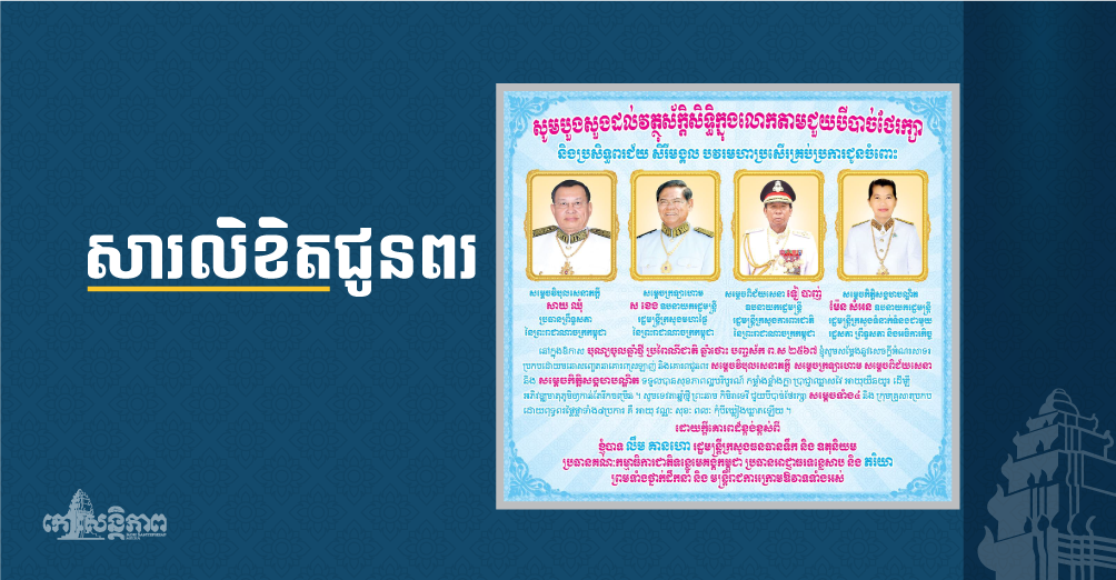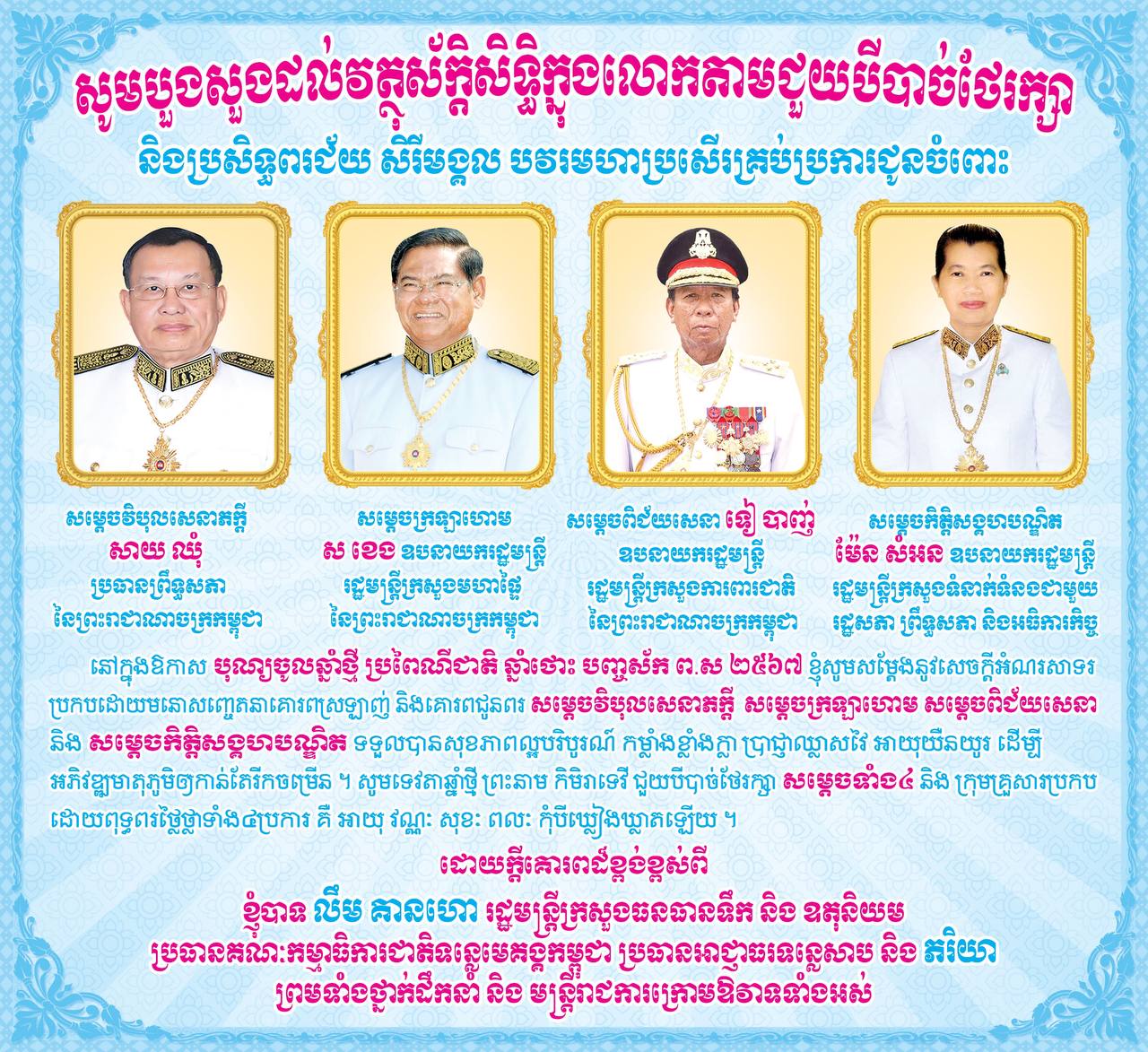 ឯកឧត្តម លឹម គានហោ សូមបួងសួង និងប្រសិទ្ធពរជ័យ ជូនចំពោះ សម្ដេចវិបុលសេនាភក្តី សាយ ឈុំ សម្ដេចក្រឡាហោម ស ខេង សម្តេចពិជ័យសេនា ទៀ បាញ់ និងសម្ដេចកិត្តិសង្គហបណ្ឌិត ម៉ែន សំអន ក្នុងឱកាសបុណ្យចូលឆាំ្នថ្មី ប្រពៃណីជាតិ