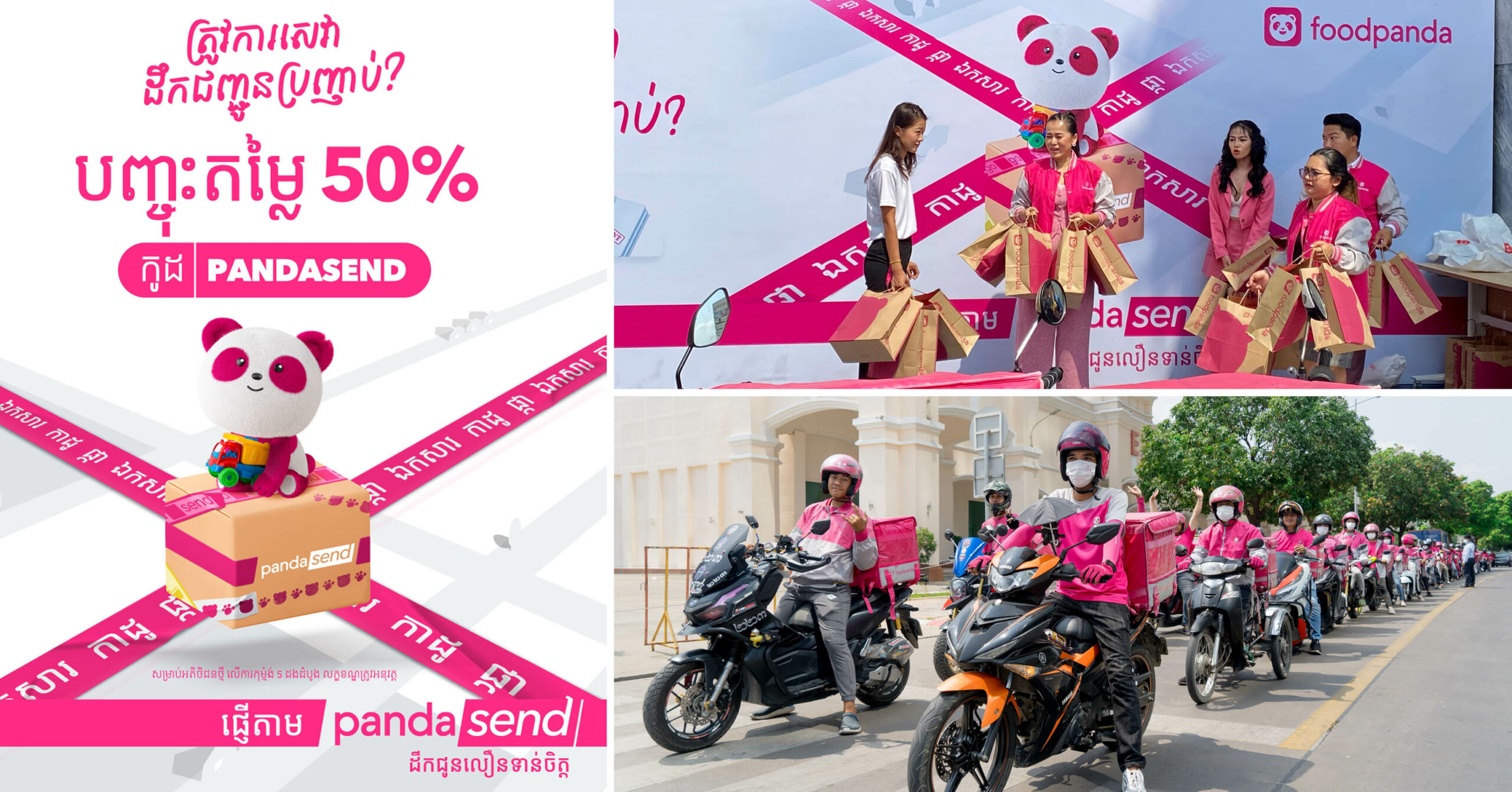 រាជធានីភ្នំពេញ ៖ កាលពីថ្ងៃទី 25 ខែមេសា ឆ្នាំ 2023 មកនេះ ក្រុមហ៊ុន foodpanda បានប្រកាសដាក់ដំណើការសេវាកម្មថ្មី pandasend របស់ខ្លួនជាផ្លូវការក្នុងរាជាធានីភ្នំពេញ ។ pandasend ជាសេវាកម្មដឹកជញ្ជូនតាមតម្រូវការ ដែលអាចជួយលោកអ្នកក្នុងការផ្ញើកញ្ចប់អីវ៉ាន់ អាហារ ឯកសារ និងកាដូហ័សទាន់ចិត្ត ជាមួយនិងតម្លៃសមរម្យទៅកាន់អតិថិជន ដៃគូអាជីវកម្ម គ្រួសារ និងមិត្តភក្ដិ ដែលស័ក្តិសមសម្រាប់ហាងទំនិញ ភោជនីយដ្ឋាន អាជីវកម្ម អនឡាញ អាជីវកម្មធុនតូច និងមធ្យម ។ល។