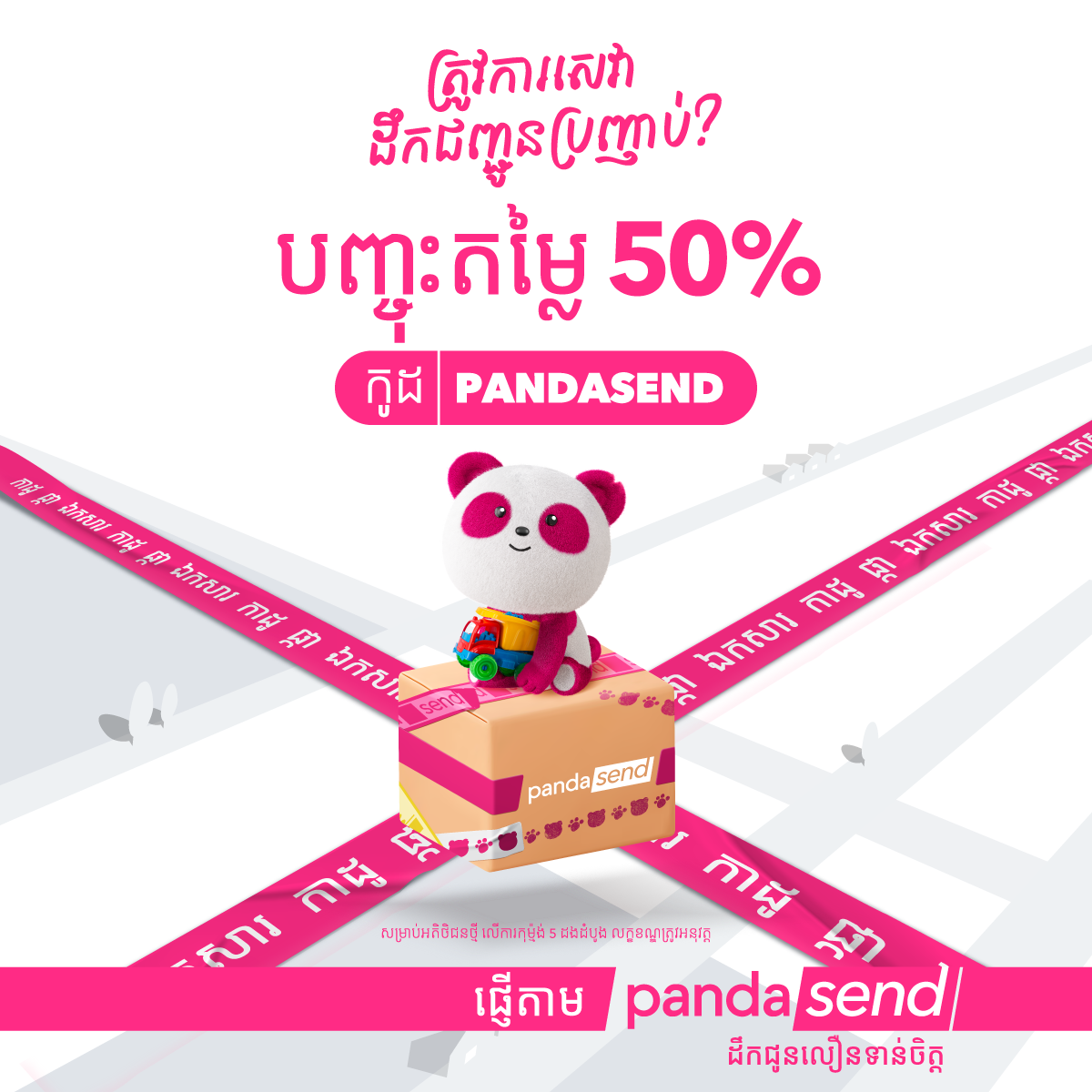ដោយឡែក ដើម្បីអបអរសាទរការដាក់ឱ្យដំណើការជាផ្លូវការនូវសេវាកម្មថ្មី pandasend រាល់អតិថិជនដែលប្រើប្រាស់សេវាកម្មដឹកជញ្ជូនរហ័សទាន់ចិត្តនេះនឹងទទួលបានការបញ្ចុះតម្លៃពិសេស 50% រហូតដល់ $3 ដែលការផ្តល់ជូននេះមានសុពលភាពរហូតចាប់ពីថ្ងៃទី 25 ខែមេសា ឆ្នាំ 2023 ដល់ ថ្ងៃទី 25 ខែឧសភា ឆ្នាំ 2023 ។