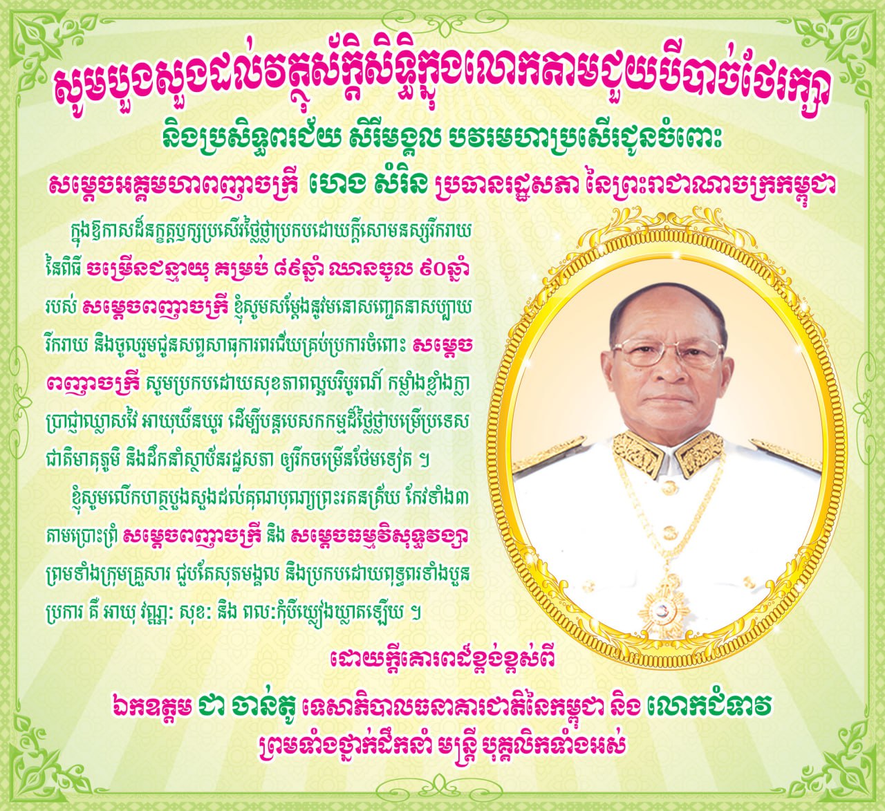 ឯកឧត្ដម ជា ចាន់តូ ជូនពរ សម្តេចអគ្គមហាពញាចក្រី ហេង សំរិន ក្នុងឱកាសចម្រើនជន្មាយុ គម្រប់ ៨៩ ឆ្នាំ ឈានចូល ៩០ ឆ្នាំ