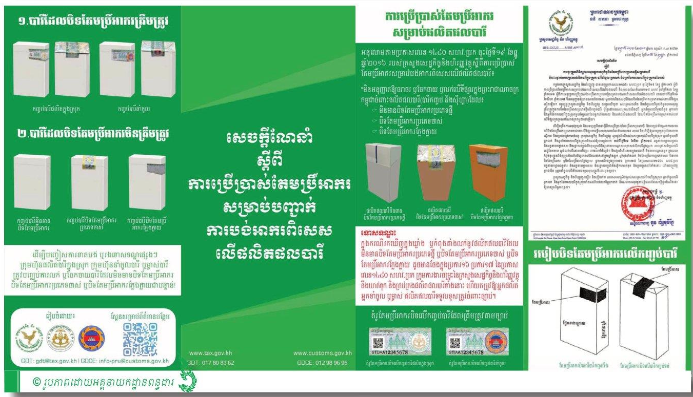 ជាមួយគ្នានេះ លោកបណ្ឌិតសហប្រធានក៏បានបង្ហាញអំពីលក្ខណៈពិសេសរបស់សន្លឹកតែមប្រិ៍អាករ ដោយបានបញ្ជាក់ថា ទាំងសន្លឹកតែមប្រិ៍ របស់ អគ្គនាយកដ្ឋានពន្ធដារ (សម្រាប់បារីផលិតក្នុងស្រុក) និងសន្លឹកតែមប្រិ៍របស់អគ្គនាយកដ្ឋានគយ និងរដ្ឋាករកម្ពុជា (សម្រាប់បារីនាំចូល) ត្រូវបានផលិតឡើងដោយប្រើប្រាស់ក្រដាសដែលមានគុណភាពល្អ ដោយភ្ជាប់ជាមួយ QR Code និងបង្កប់នូវចំណុចសុវត្ថិភាពសំខាន់ៗជាច្រើន ដែលមិនអាចថតចម្លង ឬក្លែងបន្លំបានឡើយ ។