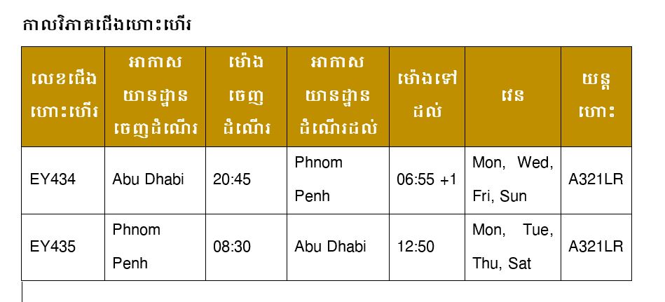 ដើម្បីជាការអបអរនៃការឈានជើងចូលក្នុងប្រទេសកម្ពុជារបស់ក្រុមហ៊ុន Etihad ក្រុមហ៊ុនបាននាំមកនូវជើងហោះហើរចំនួន ៤ ជើង ក្នុងមួយសប្តាហ៍ដែលតភ្ជាប់ប្រទេសកម្ពុជា ជាមួយនឹងបណ្តាញជាសកលរបស់ទីក្រុងអាប៊ូដាប៊ី ហើយនឹងបង្កើនជើងហោះហើរទៅដល់ប្រាំមួយជើងក្នុងមួយសប្តាហ៍ចាប់ពីថ្ងៃទី 1 ខែវិច្ឆិកា ឆ្នាំ 2025 ។