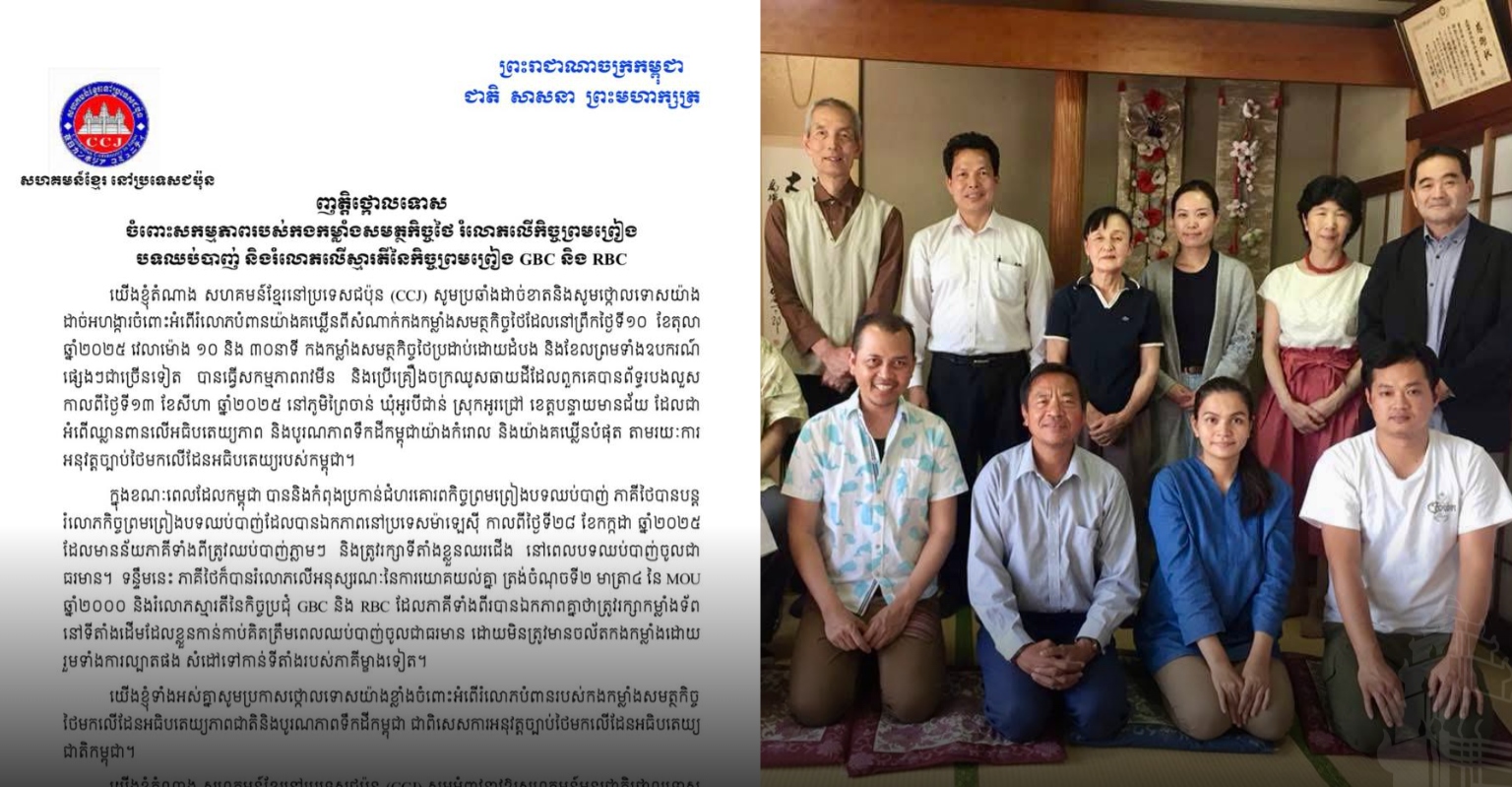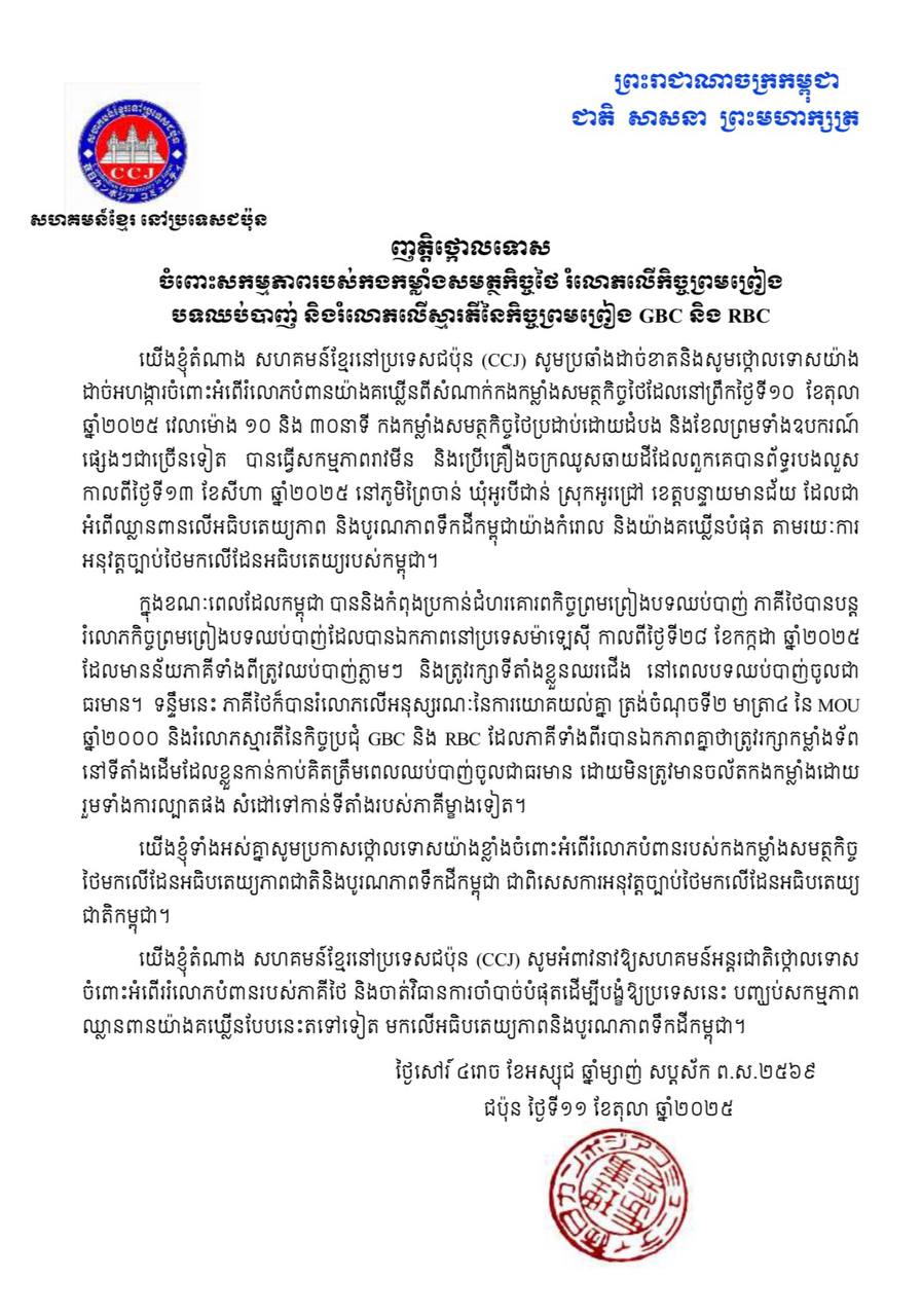 រាជធានីភ្នំពេញ ៖ សមាគមខ្មែរដែលមានមូលដ្ឋាននៅប្រទេសជប៉ុន នៅថ្ងៃទី ១១ ខែតុលា ឆ្នាំ ២០២៥ នេះ បានចេញញត្តិថ្កោលទោសចំពោះសកម្មភាពរបស់កងកម្លាំងសមត្ថកិច្ចថៃ ដែលបានរំលោ.ភលើកិច្ចព្រមព្រៀងបទឈប់បា.ញ់ និងរំលោ.ភលើស្មារតីនៃកិច្ចព្រមព្រៀម GBC និង RBC ។