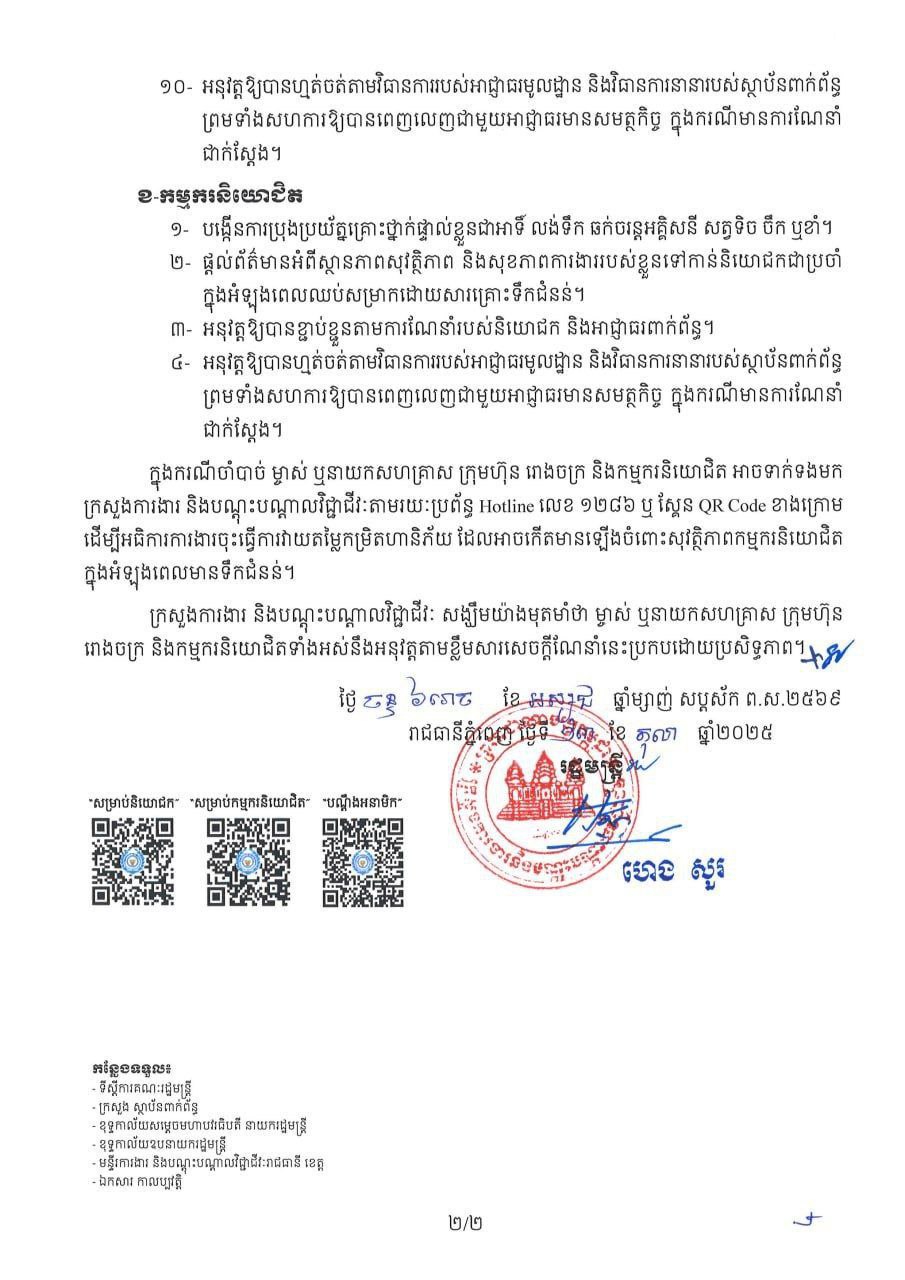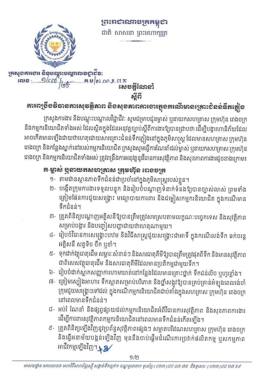 តាមរយៈសេចក្តីជូនដំណឹង ឯកឧត្តម ហេង សួរ រដ្ឋមន្ត្រីក្រសួងការងារ និងបណ្តុះបណ្តាលវិជ្ជាជីវៈ បានបញ្ជាក់ជូនទៅម្ចាស់ ឬនាយកសហគ្រាស ក្រុមហ៊ុន រោងចក្រ នូវការណែនាំ ១០ចំណុច ដើម្បីបង្ការហានិភ័យដែលអាចកើតមានឡើងជាយថាហេតុ ដោយសារគ្រោះជំនន់ទឹកភ្លៀងនៅក្នុងភូមិសាស្ត្រ ដែលមានសហគ្រាស ក្រុមហ៊ុន រោងចក្រ និងកន្លែងស្នាក់នៅរបស់កម្មករនិយោជិត ។