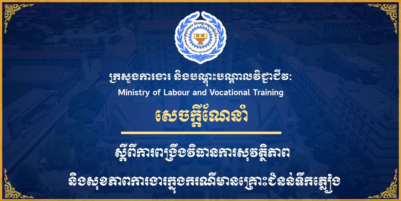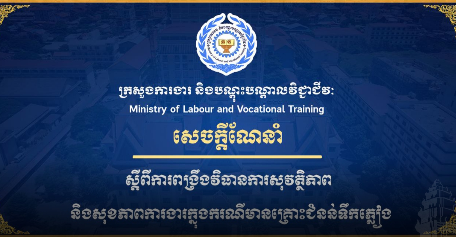 រាជធានីភ្នំពេញ៖ ក្រសួងការងារ និងបណ្តុះបណ្តាលវិជ្ជាជីវៈ នៅថ្ងៃទី១៣ ខែតុលានេះ បានចេញសេចក្តីណែនាំដល់ម្ចាស់ ឬនាយកសហគ្រាស ក្រុមហ៊ុន រោងចក្រ និងកម្មករនិយោជិតទាំងអស់ ដែលស្ថិតក្នុងដែនអនុវត្តច្បាប់ស្ដីពីការងារ ចូលរួមពង្រឹងវិធានការសុវត្ថិភាព និងសុខភាពការងារក្នុងករណីមានគ្រោះជំនន់ទឹកភ្លៀង ដើម្បីបង្ការហានិភ័យដែល អាចកើតមានឡើងជាយថាហេតុ ។