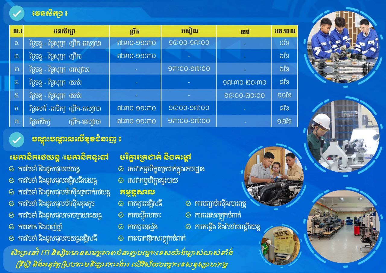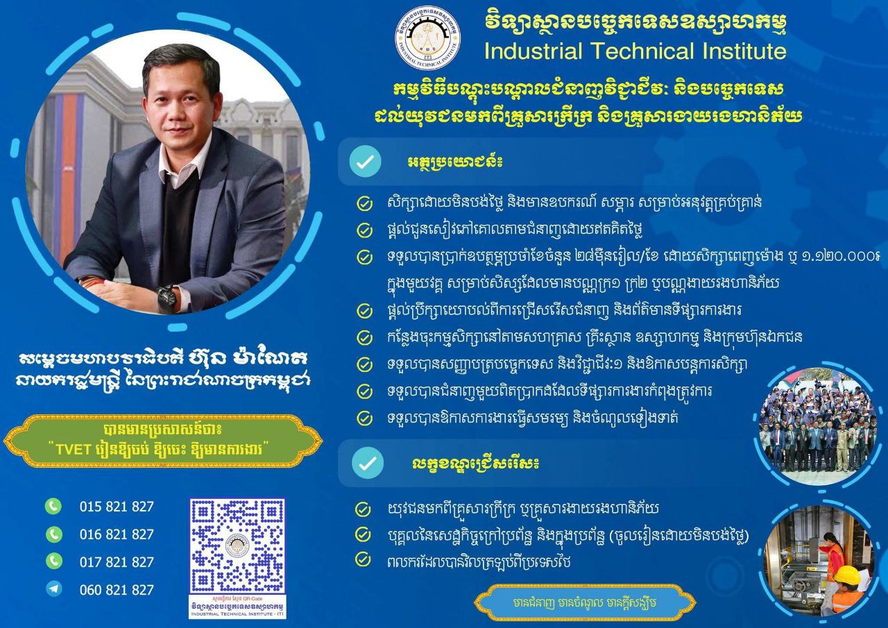 រាជធានីភ្នំពេញ ៖ វិទ្យាស្ថានបច្ចេកទេសឧស្សាហកម្ម នៃក្រសួងការងារ និងបណ្តុះបណ្តាលវិជ្ជាជីវៈ ផ្តល់អាហារូបករណ៍ចំនួន ១ ១៦០កន្លែង លើ ១៦មុខជំនាញ ដល់យុវជនមកពីគ្រួសារក្រីក្រ និងគ្រួសារងាយរងហានិភ័យ ព្រមទាំងផ្ដល់ប្រាក់ឧបត្ថម្ភប្រចាំខែ ក្រោមកម្មវិធីបណ្តុះបណ្តាលជំនាញវិជ្ជាជីវៈ និងបច្ចេកទេស ដល់យុវជនមកពីគ្រួសារក្រីក្រ និងគ្រួសារងាយរងហានិភ័យ (TVET 1.5M) ។ សម្រាប់ប្រជាពលរដ្ឋ និងយុវជន ដែលមិនមែនជាក្រុមគោលដៅ ក៏អាចស្នើចុះឈ្មោះចូលសិក្សាបានដោយឥតគិតថ្លៃផងដែរ ប៉ុន្តែមិនទទួលបានប្រាក់ឧបត្ថម្ភនោះឡើយ ។