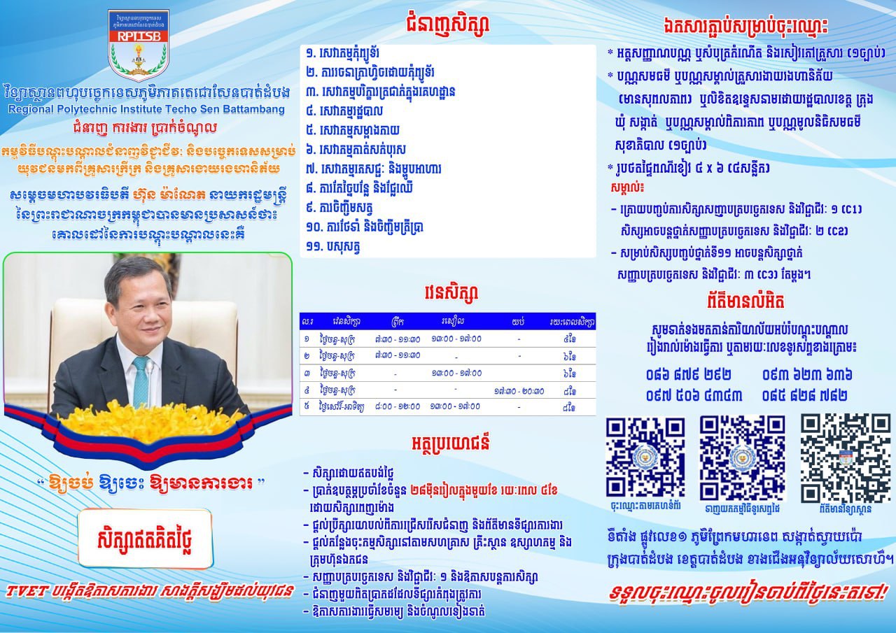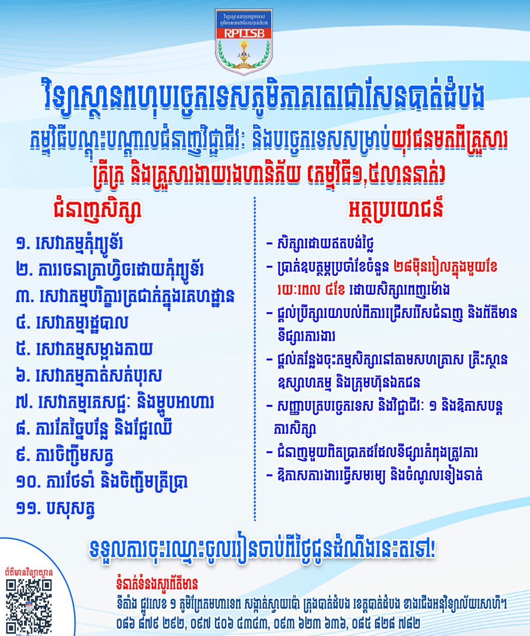 វិទ្យាស្ថានពហុបច្ចេកទេស ភូមិភាគតេជោសែនបាត់ដំបង ផ្តល់អាហារូបករណ៍ ១២ ៧៨០កន្លែង លើ ១១មុខជំនាញ និងប្រាក់ឧបត្ថម្ភ សម្រាប់យុវជនមកពីគ្រួសារក្រីក្រ និងគ្រួសារងាយរងហានិភ័យ